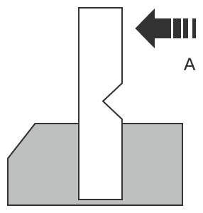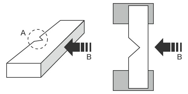 試樣有應力集中的切槽稱為“缺口”,缺口包括“V型缺口”和“U型缺口”。此外,還有“沿邊衝擊”和“橫向衝擊”的試樣。沿邊衝擊對試樣的窄邊賦予衝擊,而橫向衝擊對試樣的寬邊賦予衝擊。下面是當用沿邊衝擊進行測試時試樣和打擊方向的例子。