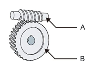 由帶有螺紋的軸『蝸桿』(A零件)與其對應的蝸輪(B零件)所構成的齒輪組,稱為『蝸輪蝸桿』。蝸輪蝸桿被分類為交錯軸齒輪,多數的交叉角度為90°。此外,由於減速比大,因此在需要轉換旋轉方向,同時又需要大減速比時使用。