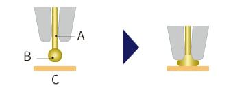 1. 金線穿過稱為瓷嘴的注射器狀圓柱體。用高壓點燃打線末端使其變圓,然後將該部分接合於要連接的電極。這稱為Ball Bonding(焊球接合)或1st Bonding(第一次接合)。接合是通過瓷嘴力、超聲波和來自接合階段的熱量來完成的。