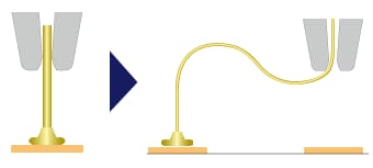2. 當1st Bonding結束移動到2nd Bonding點時,接合線不斷送出,接合線在瓷嘴的移動下形成環路。