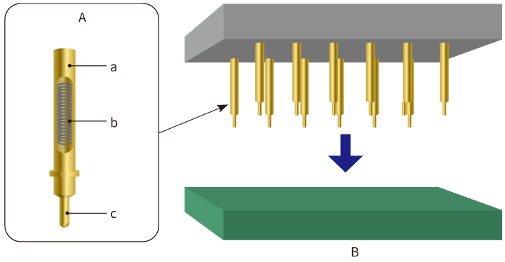 帶有塊的探針卡,探針垂直固定在印刷電路板上。