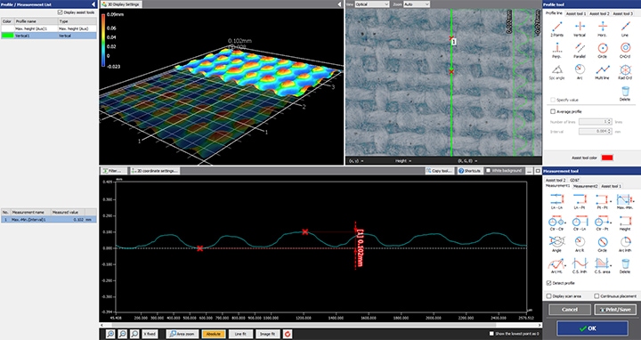 另外,由於可以依照對象物的特徵資料自動校正位置,不需要進行嚴格的調整出水平狀態和定位。此外,業界首創的「Smart Measurement功能」能夠判斷對象物的尺寸,自動設定測量範圍,並移動載物台,完全解決了設定測量長度和Z範圍的麻煩。
