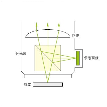 光的干涉現象,即從目標物件表面到某點為止的光線距離(光徑)上產生差異的現象。光干涉儀就是利用此現象來檢測目標物件表面的凹凸起伏。右圖為干涉儀的結構圖,光源(半導體雷射等)發出的光經過分光鏡,一部分會穿透到參考面鏡,另一部分則反射到樣本表面。穿透的光在參考面鏡反射,在受光元件CCD 元件上成像。而反射到樣本表面的光,則在目標物件表面反射,再穿透分光鏡,同樣在受光元件CCD 元件上成像。