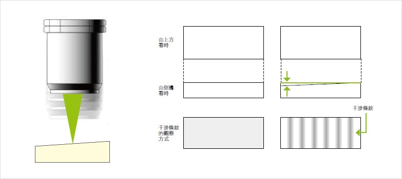 事先將CCD 元件到參考面鏡的光學距離(光徑),設計成和CCD 元件到樣本表面的光學距離一樣,讓聚焦在CCD 元件上的影像,反映出樣本表面凹凸造成的光徑差異所產生的干涉條紋。只要計算干涉條紋的線數,就可以讀取樣本表面的凹凸(高度)。