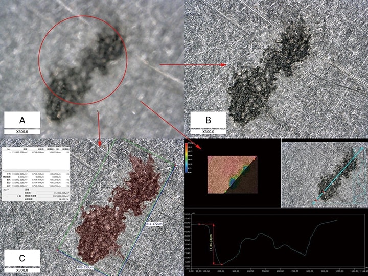 簡單操作即可實現自動面積量測(C)與3D形狀、輪廓量測(右下)。