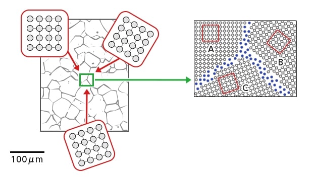 一般金屬組織是由原子規則排列的「結晶結構」組成,但並非所有原子都會規則排列。多數規則排列的結晶結構稱為「多晶」,在原子排列混亂區域中,結晶粒和結晶粒的境界則稱為「結晶晶界」。