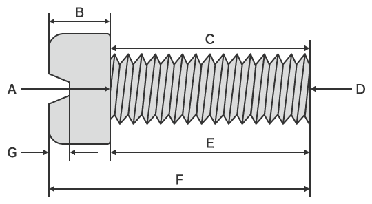 一般會將外螺紋的長度稱為「公稱長度」,用來指頸下長度(圖中E)。但其定義會隨螺絲種類及頭部形狀而異。舉例來說,若是接合時頭部不會突出的皿頭螺絲,則以全長(圖中F)為公稱長度。
