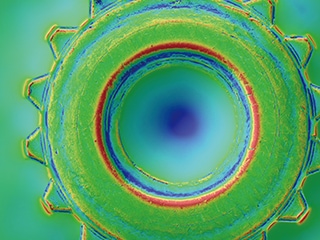 將光影模式影像與目標物的色彩資訊重疊,即可同時呈現凹凸資訊與色彩資訊。此外如下方影像,透過將凹凸資訊分色顯示的「色圖影像」,還能將像小型螺帽的起伏一樣的細微凹凸資訊也清晰地可視化。
