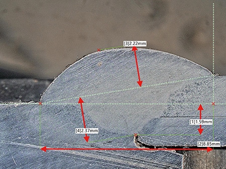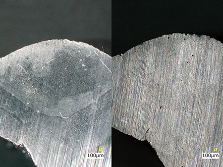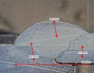 焊接部位截面的尺寸量測,是強度和品質的重要檢查。若使用以往的立體顯微鏡,對母材和焊珠的對比度較低,難以判斷量測位置。還必須目測對準刻度,手動輸入數值,導致人為誤差等課題。
