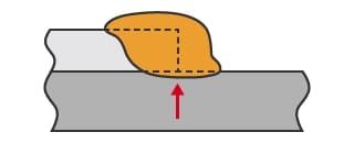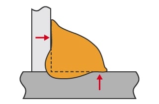 - 有部分熔融金屬未熔入母材的不良。薄板的T(水平填角)接頭的範例如圖所示。原因包括熔融金屬的輸入熱不足、熔融金屬向前流動,而環縫銲接則發生於前行焊珠和後行焊珠尚未充分焊透即進入搭焊時等。