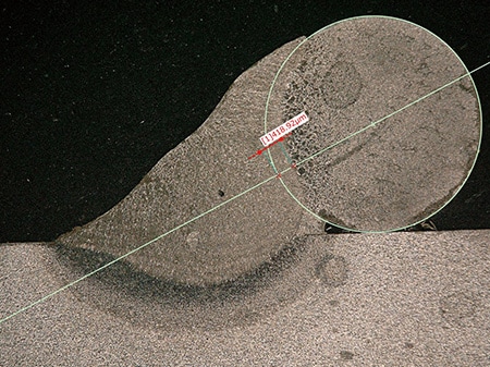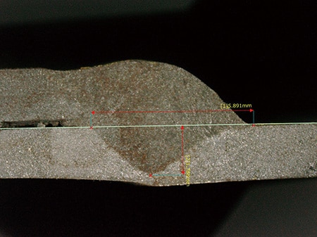 透過量測焊接後的焊珠截面大小「喉深(Throat depth)」與「焊接腳長度」、「焊透深度」等,檢查焊接品質也很重要。一般利用巨觀量測焊接後的截面,進行焊接部位的品質評估。