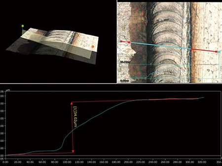 焊珠有連續的凹凸形狀。焊珠表面有銲縫凸量不足、重疊、脫模死角、細孔、裂紋等的不良(非連續性)時,就無法得到原本想要的機械特性,成為破損原因。一般的顯微鏡只能對焊珠凹凸部分對焦,而且無法取得銲縫凸量等評估所需的高度資訊。
