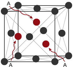 進行淬火時,鐵的形狀變化原子位於立方體各頂點及面的中心的「面心立方晶格」,碳從而滲入。