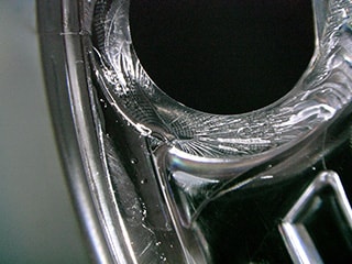 原因:射出成型時射出的熔融樹脂溫度太低,或射出速度太慢,導致樹脂在模具內的流動性變低。和之後再射出的樹脂重疊而發生。 - 龜裂、網狀裂紋
