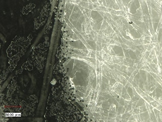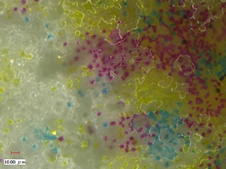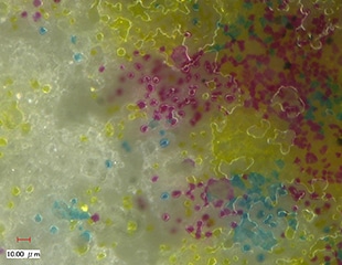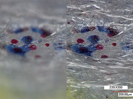 使用「VHX系列」,以超出以往顯微鏡20倍的景深,與「即時景深合成」的整體全對焦影像,清晰掌握用紙結構與碳粉附著狀態。實現正確且快速的觀察分析。