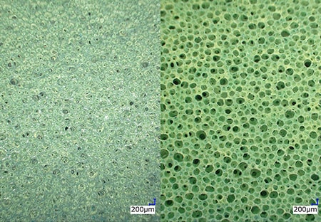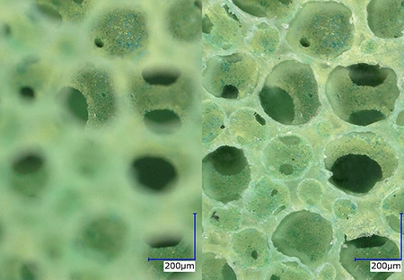 以往的顯微鏡受限於景深與解析度不足,難以觀察海綿滾輪的複雜凹凸形狀。使用4K數位顯微鏡「VHX系列」,能以直覺操作自動切換倍率,執行高達6000倍的「無縫縮放」與「即時景深合成」。即是在高倍率下,也能以高解析度進行觀察部位的整體全對焦,用簡單操作實現海綿滾輪細微凹凸形狀的觀察。