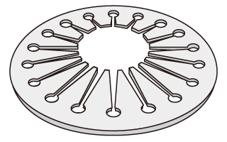 - 將圓錐形板簧加工成中心挖空的形狀。代表性的用途是螺絲的防鬆墊片。