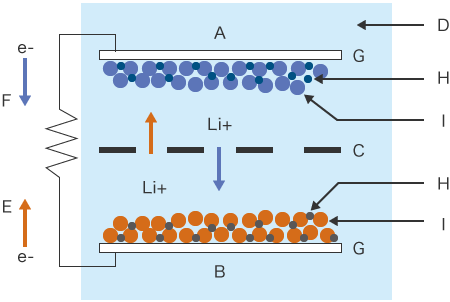 - G)集電體:扮演集中發電電力的導電體角色和支持體角色。正極用鋁箔,負極用銅箔。