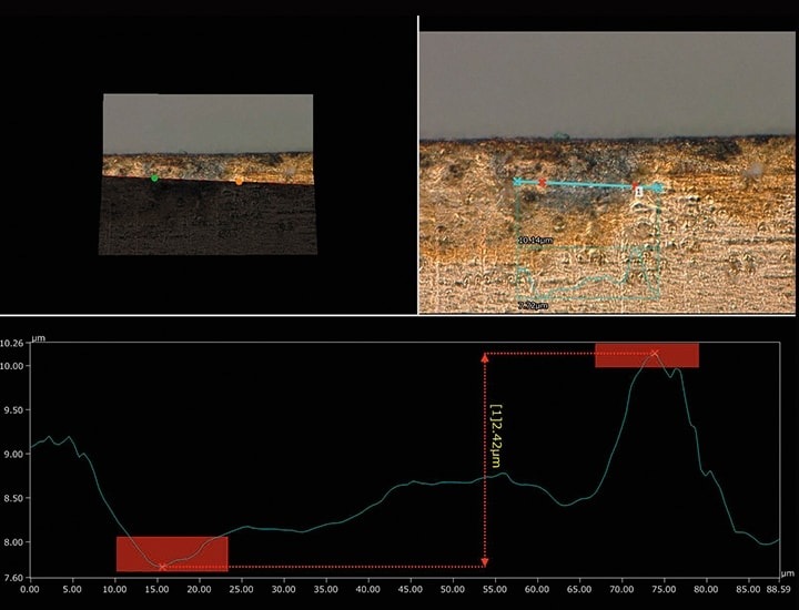 此外可直接由放大影像進行2D尺寸量測與3D形狀、輪廓量測等,僅需1台即可輕鬆快速完成鍍膜不良檢查的品質管理、品保所需作業。