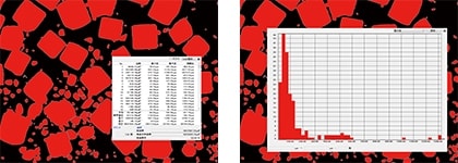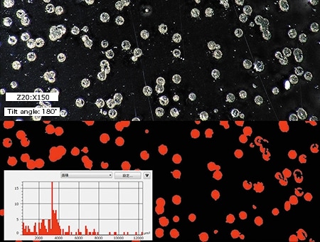 透過自動量測,可輕鬆進行指定範圍內的面積量測與結晶粒度、粒子計數。連二值化處理與量測結果的一覽顯示、柱狀圖及報告都可經由簡單操作完成。