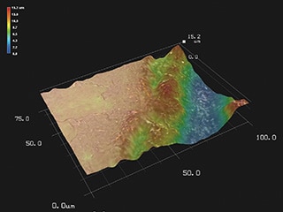 4K數位顯微鏡「VHX系列」即使是有凹凸的IC圖形,也可合成不同焦點位置,瞬間取得全幅對焦的影像。利用這些資料進行「3D顯示」,即可從各個角度自由觀察IC圖形的表面形狀。