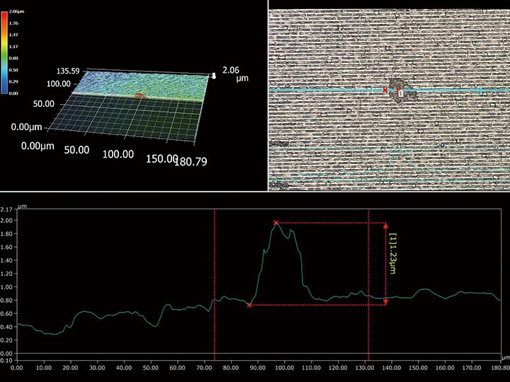 還能用少張影像生成3D影像、量測3D形狀,利用高度彩色影像取得缺陷部位的凹凸量測值進行分析。此外透過「自動面積量測工具」,顯示光罩量測與量測值、直方圖,大幅提升作業效率。