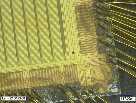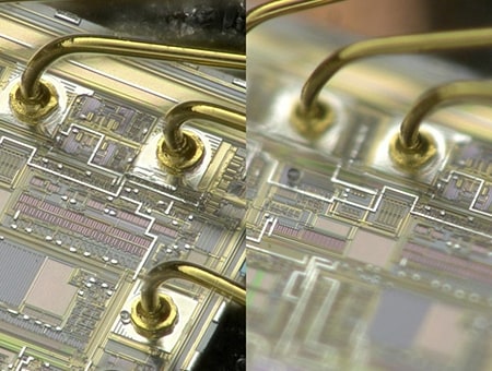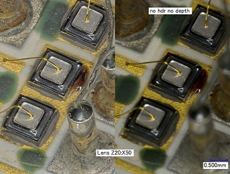 以往的顯微鏡難以對立體的打線接合處進行整體對焦,還會受到光暈的影響,極難取得清晰的影像。
