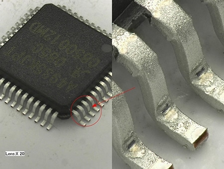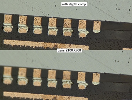 「VHX系列」透過「全角度觀察系統」,可從傾斜的角度高倍率觀察封裝表面與針腳。相較以往的數位顯微鏡,實現約20倍的大景深,不需要繁瑣的焦距調整,即可用整體全幅對焦的影像快速實現高精度分析。
