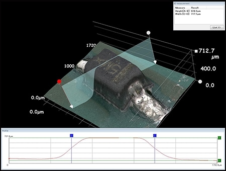 也能用「VHX系列」直接進行異物3D形狀、輪廓量測。異物大小、結構、體積的定量評估,並使用拍攝影像與量測值編製報告,僅用1台即可快速完成作業。