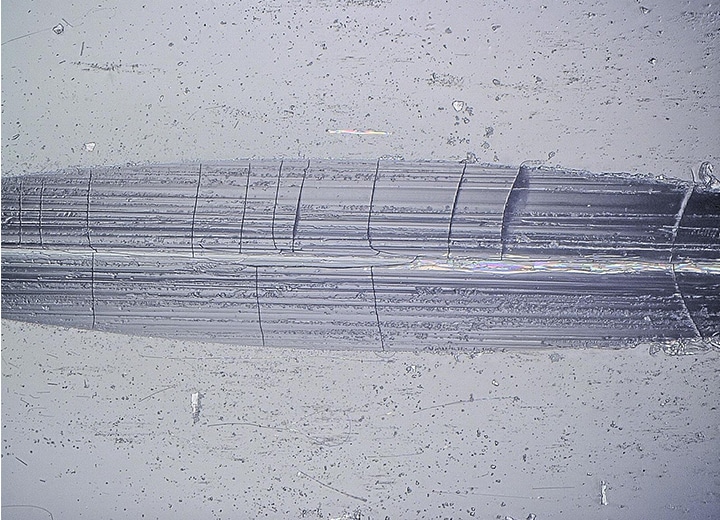 4K數位顯微鏡「VHX系列」搭載了兼顧光學顯微鏡20倍以上的大景深與高解析度的光學系統。即使是有深度的目標物,也能用整體對焦的高精細影像進行觀察。此外,搭載了瞬間合成多張對焦影像的「深度合成」功能。即使在高倍率下,對於玻璃厚度內有深度的微小破裂或氣泡等,也能用全對焦於整片視野的4K影像,清晰地觀察全貌。
