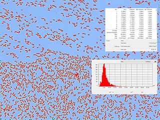 只要對取得的高解析度影像運用「自動面積量測、菌落計數」功能,就能在指定範圍中正確且毫無偏差地執行。能以目的閾值執行二值化處理,也能一一分割顯示任意範圍中的菌落影像,或以柱狀圖顯示每片面積的分布等,透過各種顯示方法來大幅提升分析效率。