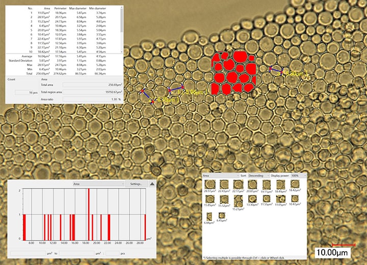 只需指定範圍,「自動面積量測、計數」功能就能正確計數細菌,除了面積、周長、最大直徑、最小直徑以外,還能自動量測與計算選擇範圍中細菌的面積平均值、標準偏差、最大值、最小值、面積率等,並以清單顯示詳細數值。