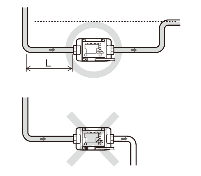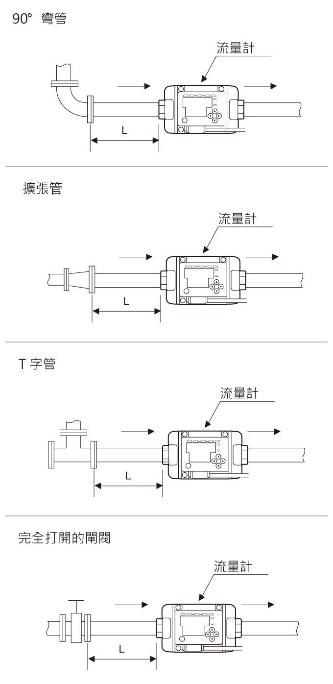 為了在最可靠的條件下使用流量感測器,有必要考慮管路與流量計的安裝位置。雖然不是非如此不可,但為了最穩定地量測流量,最好能遵循這些建議。