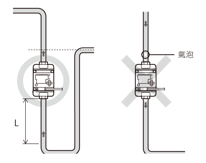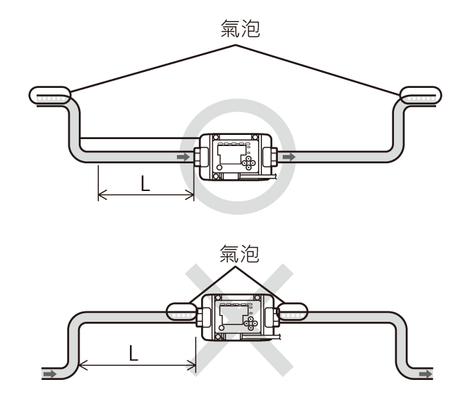 氣泡會聚集在水的上半部分。管路如上圖所示彎曲時,可以阻止氣泡混入流體中。