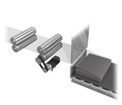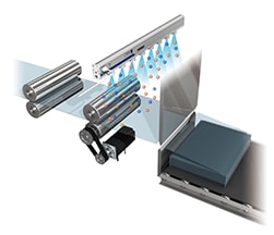 薄膜以滾軸輸送方式輸送至裁切機。當薄膜輸送至裁切機達一定的長度後,裁切刀會降下進行裁切。由於滾軸輸送的薄膜會因帶電而附著於刀刃上,使得薄膜無法正常輸送,導致刀刃未切到薄膜或裁切成錯誤的尺寸。