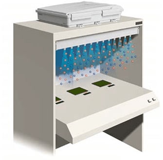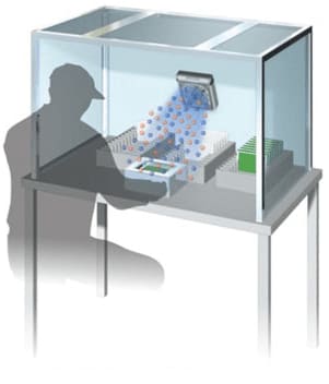 在組裝工作台內的頂板加裝棒型靜電消除器,可建立大範圍無靜電的空間。