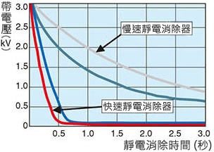 「靜電消除速度」是指能以多快的速度、在多短的時間內完成靜電消除作業的性能。在製造現場中,為了避免影響到運作中生產線的產距時間,就必須要能快速消除靜電。因此消除靜電所需的時間越短,性能就越高。