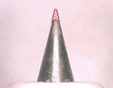 在進行此吸收、釋出時,會因物理性的撞擊能量造成電極針的尖端處隨著使用時間而逐漸被磨損,且變得越來越圓。