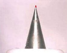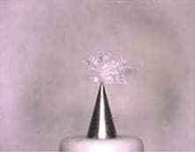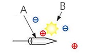 另外,連續施加正電壓的電極針尖端處與連續施加負電壓的電極針相比較下,前者的針尖磨損較嚴重,呈圓形。其原因是由於正電壓在「吸收電子」時的撞擊能量,比負電壓「釋出電子」時的撞擊能量更大所致。