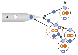靜電消除器在生成正離子和負離子時,會利用電極針前端「吸收電子」(電子是離子生成的來源)成為正離子,或「釋出電子」以成為負離子。