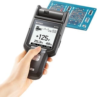 下圖左邊的例子是正在量測電路基板的靜電。只需要將靜電感測器朝向電路基板即可量測靜電量。