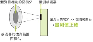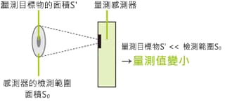將被量測目標換算成無限大數值的量測器相當多。被量測目標物若充分大於量測感測器的檢測範圍時,越能顯示出正確的量測值,但若小於上述量測範圍時,則將顯示較小的量測值。(圖1)