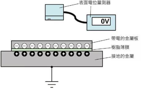 - 在表面電位的量測中必須注意的是量測金屬板上貼附的薄膜,以及在中間夾入薄膜的金屬板。此時即使帶電,電位仍會顯示趨近0 V 的數值。圖2 是夾入樹脂薄膜的金屬板之範例。由圖可見金屬板雖然帶電,但在接地的金屬側出現感應電荷,從外部與此抵銷,而呈現未帶電狀態。因此,接地的金屬上貼附的被量測物是否帶電,無法透過表面電位計得知。
