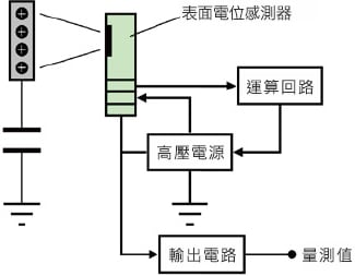 但是,亦有些產品是透過控制高電壓電源的輸出電壓,依據該輸出電壓與表面電位計的輸出值,來量測被量測目標的表面電位。這種方法可量測的電壓範圍不會受到高電壓電源的輸出電壓範圍的限制,可量測更廣大的電壓範圍。