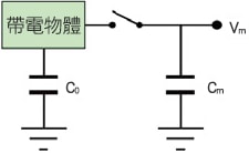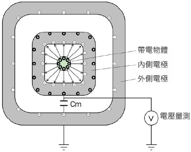 圖6 是法拉第籠法的原理圖,包括了與完全絕緣的內側電極接地的外側電極。內側電極內部若放入帶電物體,將依帶電物體的帶電大小,在內側電極感應電荷。外側電極則進行接地。其原理是量測內側電極與外側電極的電位差Vm,以求出帶電物體的電荷量。