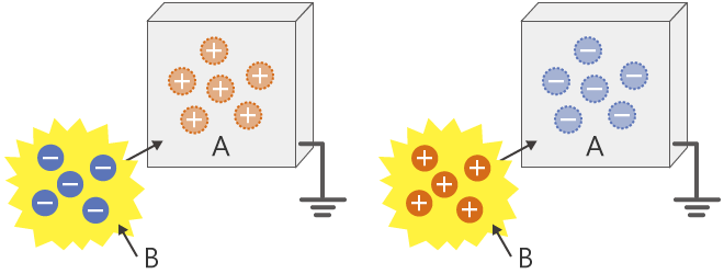 帶正電的異物一旦靠近導體周圍,導體表面就會帶負電荷,反之,若是帶負電的異物靠近,則導體的表面將會帶正電荷。此狀態正如同磁鐵的N極與S極會相吸,導體表面的狀態會呈現帶有與異物極性相反的靜電。