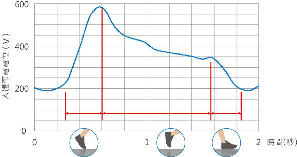 以下圖表是調查人走路時會帶多少電的調查結果。由曲線可看出每前進一步的動作之間,帶電量也持續在變化。