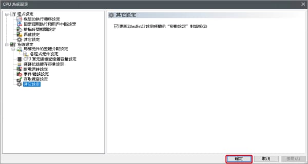 在 EtherNet/IP 連接上分配變數時,請在“CPU 系統設定”對話框中的“系統設定”的“其他設定”中勾選“更新 Ether-Net/IP 設定時顯示"變數設定"對話框(E)。