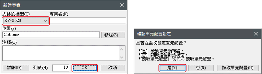 1. 啟動 KV STUDIO 並創建一個新專案。將支持的機型設置為 "KV-X520",然後點擊 [OK]。