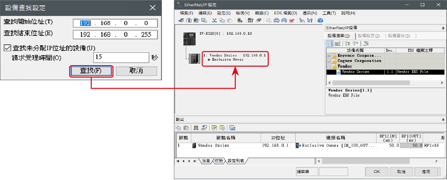 7. 專案傳輸完成後,顯示 [設備查找設定]對話框。然後點擊 [查找 (F)]。自動配置完成後,將自動添加 「Vendor Series」。然後點擊 [OK] 關閉 [EtherNet/IP 設置] 視窗。